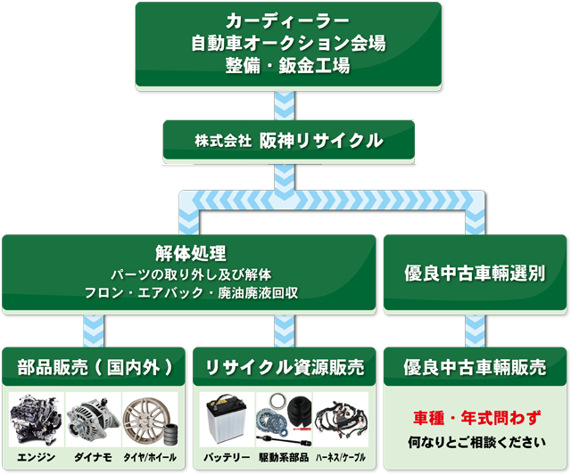 弊社(旧社名:阪神オートリサイクル:「HAR」)は施行に先がけ2002年より市場調査・勉強会を重ね、この法律を遵守した適正処理工場を設立し日々自動車のリサイクルに努めています。
