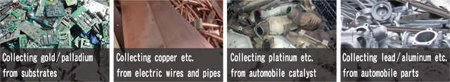 We deal in a wide range of metal such as aluminum (Al), copper (Cu) and steel use stainless (SUS), Non-ferrous metal such as zinc (Zn), lead (Pb), tin (Sn) and brass, and precious metal such as gold (Au), silver (Ag), platinum (Pt), palladium (Pd) as our Material Business.